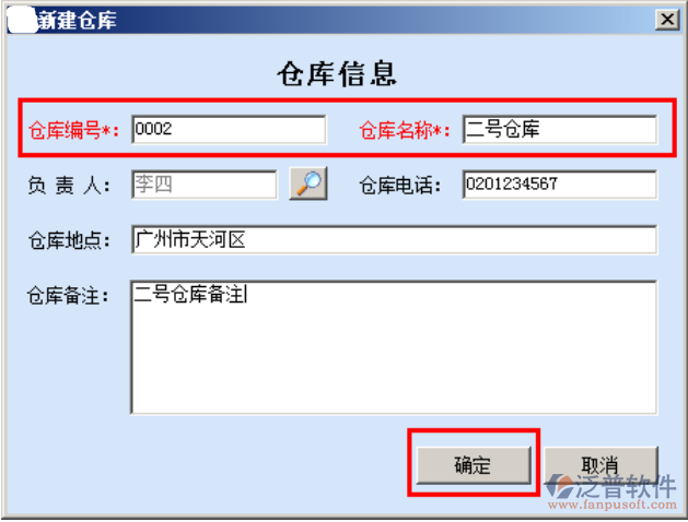 “項目信息管理”下“新建倉庫”彈出新建倉庫信息,倉庫編號系統(tǒng)自動生成,輸入倉庫名稱,選擇負責人等其他信息點擊確定,如圖