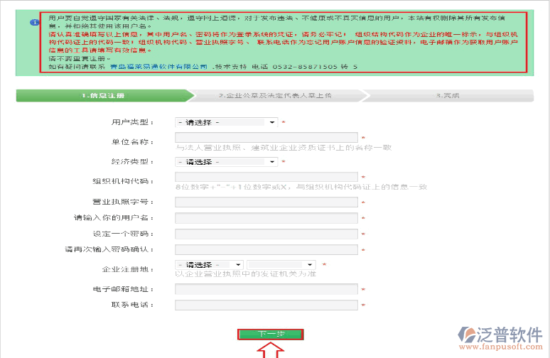 填寫(xiě)完以上信息,點(diǎn)擊“下一步”按鈕,進(jìn)入企業(yè)公章及法定代表人章上傳頁(yè)面。