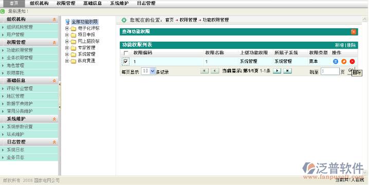 選擇要刪除的功能權限,點擊該信息列右邊的刪除按鈕,或者列表右上方的刪除按鈕
