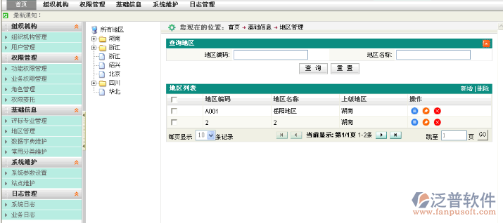 點(diǎn)擊基礎(chǔ)信息模塊下的地區(qū)管理菜單,進(jìn)入地區(qū)管理頁面,如圖1,