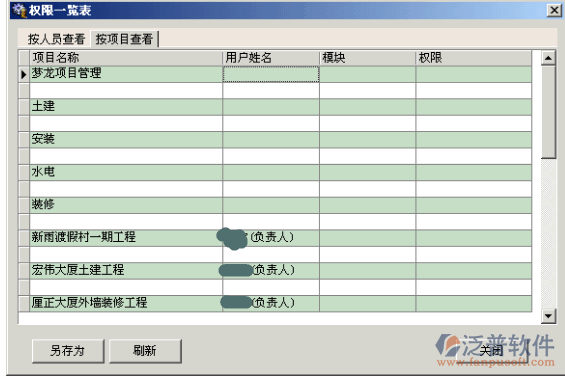在權(quán)限一覽表內(nèi)我們可以按人員查看和按項(xiàng)目查看有關(guān)項(xiàng)目的相關(guān)信息,也可另存為Excel 文件格式。