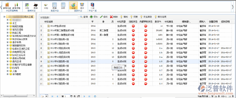 在彈出窗口的【投資計劃明細】頁面中,主頁面中的計劃屬性包括總計劃、年計劃、季計劃、月計劃,其編制內(nèi)容也根據(jù)總、年、季、月劃分,各自的計劃屬性對應(yīng)各自的編制,其中常規(guī)的顯示項可直接編輯,點擊【計劃明細】,可編輯單個項目的計劃明細:
