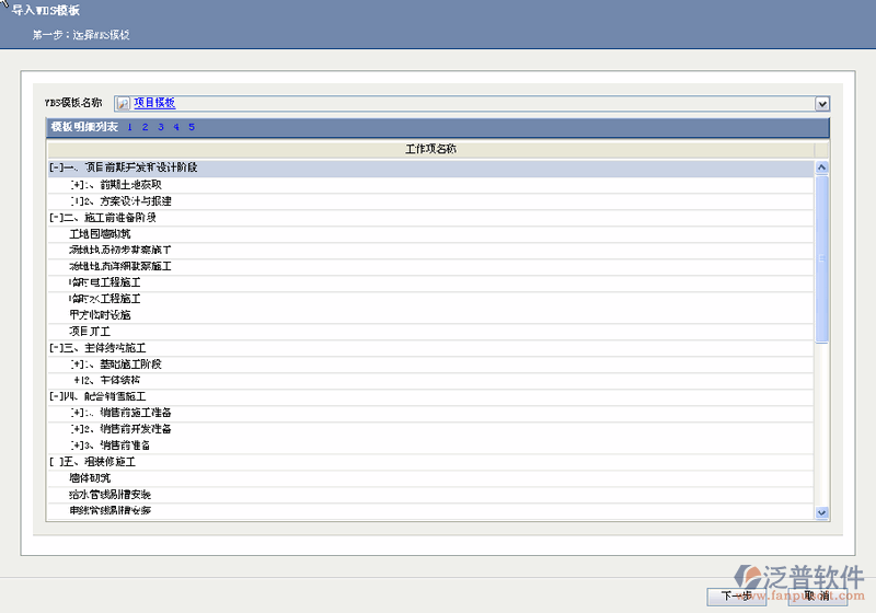 n 導入操作:點擊〖編輯〗按鈕后,在〖導入導出〗列表中選擇〖導入WBS模板〗,打開導入WBS模板窗口,如圖2-25所示。在WBS模板列表中選擇一個模板,點擊〖下一步〗,打開如圖2-26所示的窗口,錄入相關(guān)信息后,點擊〖確定〗即完成導入功能。