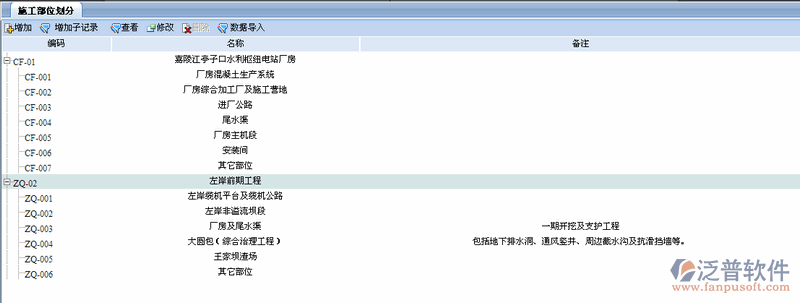 工程劃分是為安全、質(zhì)量提供管理基礎(chǔ)點的,所以劃分時盡量貼近安全、質(zhì)量的使用,并不一定把施工組織設(shè)計中的單元工程劃分做進(jìn)去,頁面示例中不難看出使用者劃分了兩次,第二次劃分時刻意說明了是虛擬的單項工程清單,這是沒有必要的。因為這是實際的劃分,直接做到系統(tǒng)中就可以了。A、B、C、D···編號的單元工程清單不難看出是施工組織設(shè)計中規(guī)定的,它實用于分部分項工程驗收。實際劃分時編號可參照項目管理文檔編號,一般為4級(也可以是3級)前3級用十位順序號,最后一級用百位順序號。