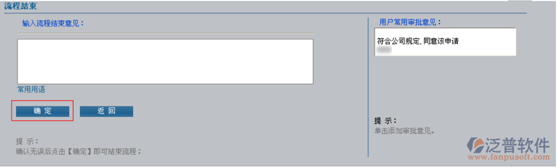 e) 輸入流程結(jié)束意見,單擊右側(cè)文本框中的同意后,點(diǎn)擊【確定】按鈕,結(jié)束流程。