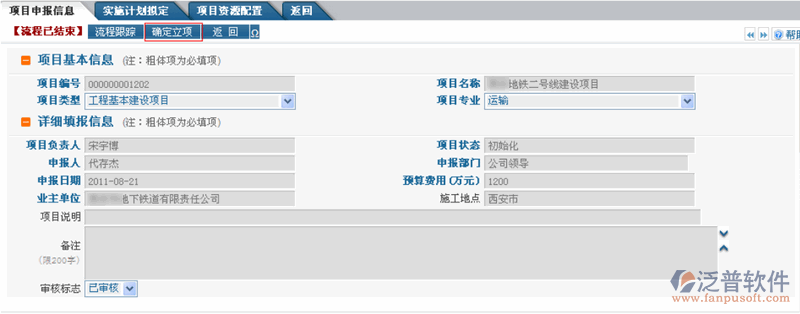 點(diǎn)擊【確定立項(xiàng)】按鈕,對(duì)申報(bào)的已經(jīng)通過(guò)審批的項(xiàng)目進(jìn)行立項(xiàng),該項(xiàng)目信息添加入項(xiàng)目立信息中。只有已經(jīng)通過(guò)項(xiàng)目申報(bào)審批流程以及沒(méi)有立項(xiàng)的項(xiàng)目有確定立項(xiàng)按鈕。