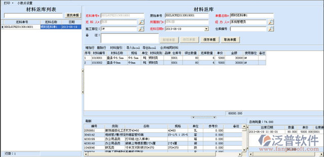 “材料應(yīng)用管理”下“返料歸庫單”,基本操作與入庫單操作類似,這里就不多做介紹,具體界面如圖