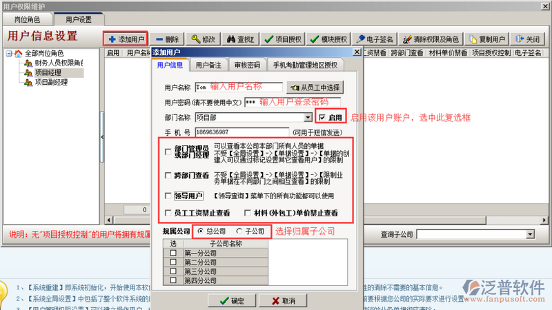輸入用戶名稱(可從員工中選擇),輸入用戶“登錄密碼”,選擇“部門名稱”,啟用該用戶則可勾選“啟用”的復(fù)選框,可按照用戶的崗位及權(quán)限選擇對應(yīng)的查看權(quán)限,選擇用戶歸屬子公司。