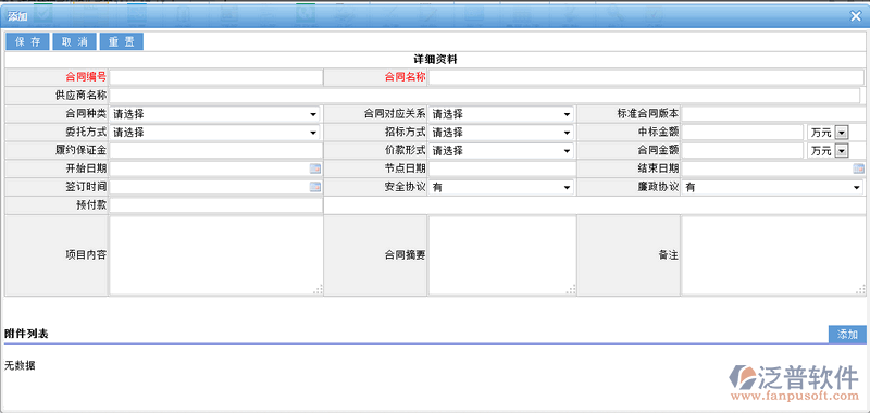 在【合同擬定】頁面,點擊【添加】按鈕,彈出合同信息錄入窗口如下圖所示: