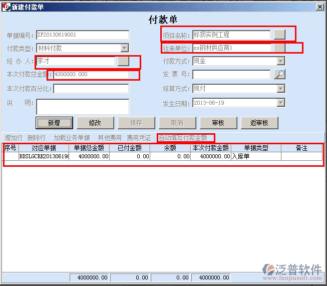 “財務管理”下的“新增預付款單”,選擇項目名稱,往來單位,發(fā)生日期,經(jīng)辦人,付款方式,預付總金額,等信息,然后保存。在付款單中可以直接調(diào)用預付款單進行沖銷。