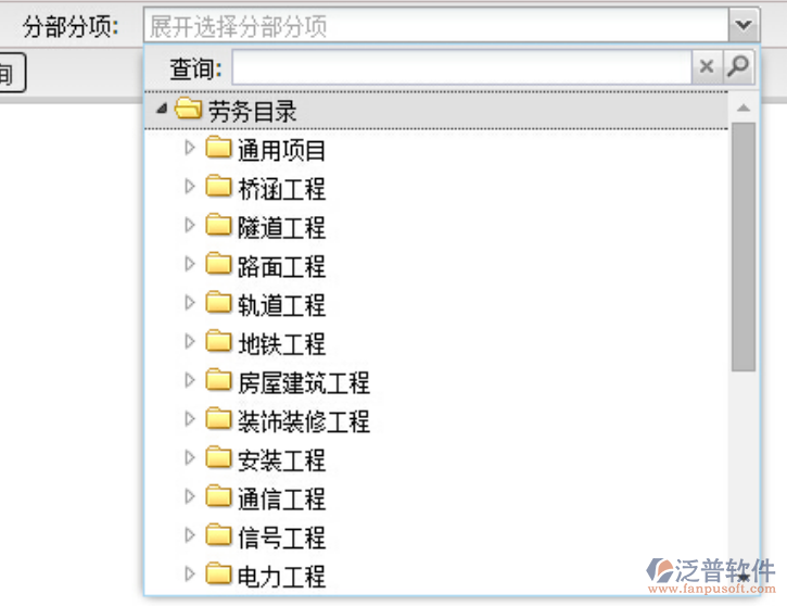 點(diǎn)擊【分部分項】下拉框,會加載出所有的勞務(wù)目錄,點(diǎn)擊其中一個進(jìn)行選擇: