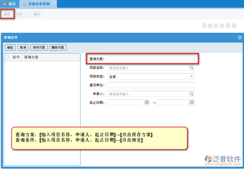 (2)、查詢方案:將經(jīng)常查詢的條件選擇好后,輸入方案名稱,就可以點擊保存方案,有助于下次查詢的時候直接快速點擊查詢的方案,就不用再次選擇條件