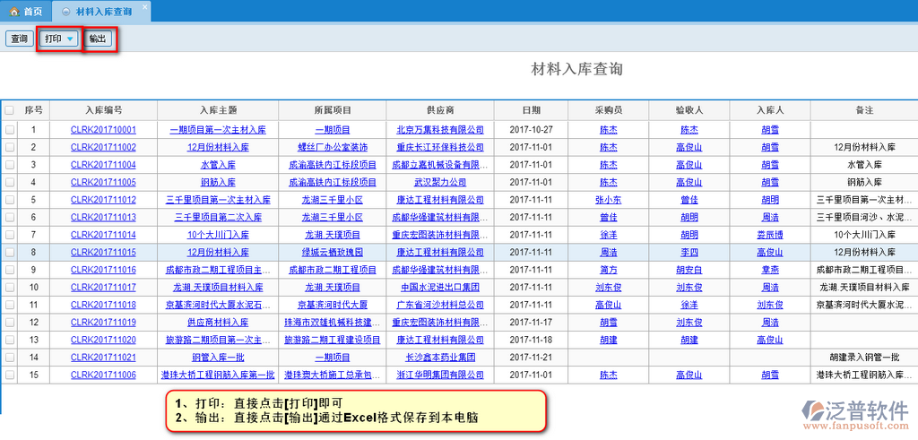 (2)、也可通過(guò)報(bào)表中藍(lán)色字體的字段,比如:入庫(kù)編號(hào)、入庫(kù)名稱(chēng)、所屬項(xiàng)目、采購(gòu)員、驗(yàn)收人、入庫(kù)人,可查詢材料入庫(kù)的詳細(xì)表單數(shù)據(jù)
