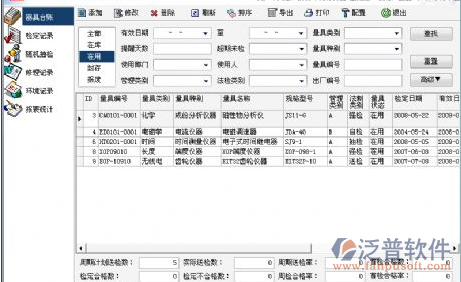 器具臺(tái)帳:計(jì)量器具管理的臺(tái)帳一般有好幾大本,有總臺(tái)帳和各分類臺(tái)帳,各類分類臺(tái)帳,按性質(zhì)不同,又有不同的分類方法,按計(jì)量類別分有長(zhǎng)度類的,電磁類的;按使用部門分,有一車間、二車間等;按強(qiáng)制檢定非強(qiáng)制鑒定分,有屬于強(qiáng)制檢定的和非強(qiáng)制檢定的。這些賬目要一致,帳物要一致,數(shù)量不能錯(cuò),要是手工記錄工作量大,查對(duì)非常不方便,難免會(huì)出帳物不符的差錯(cuò)。