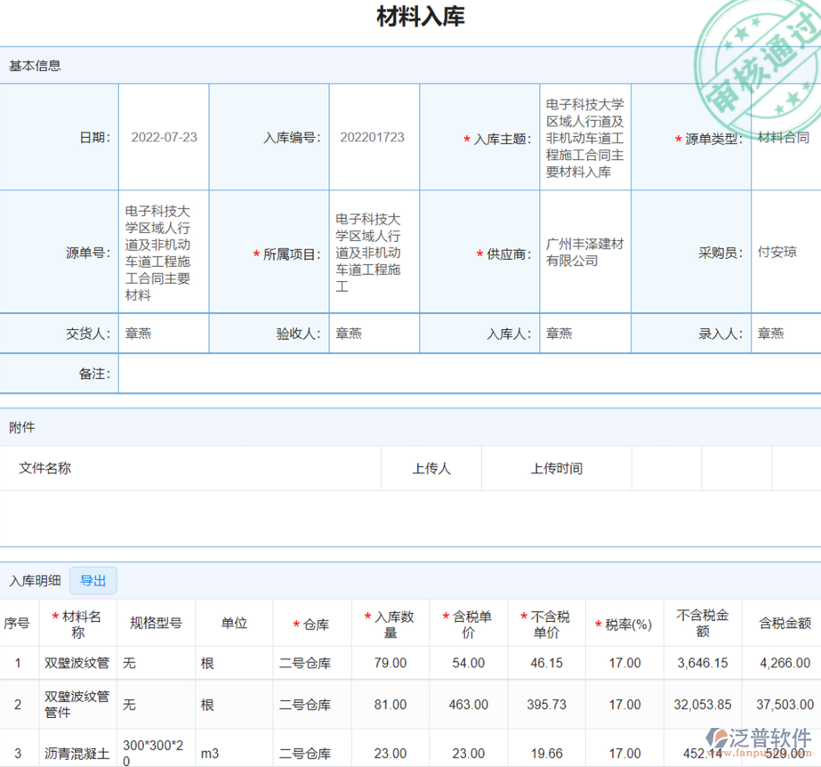 1、規(guī)范了材料入庫填寫的內(nèi)容,員工根據(jù)泛普軟件提供的模板填寫相應的信息,還可將出庫現(xiàn)場照片上傳到附件中,方便管理層隨時進行監(jiān)管。