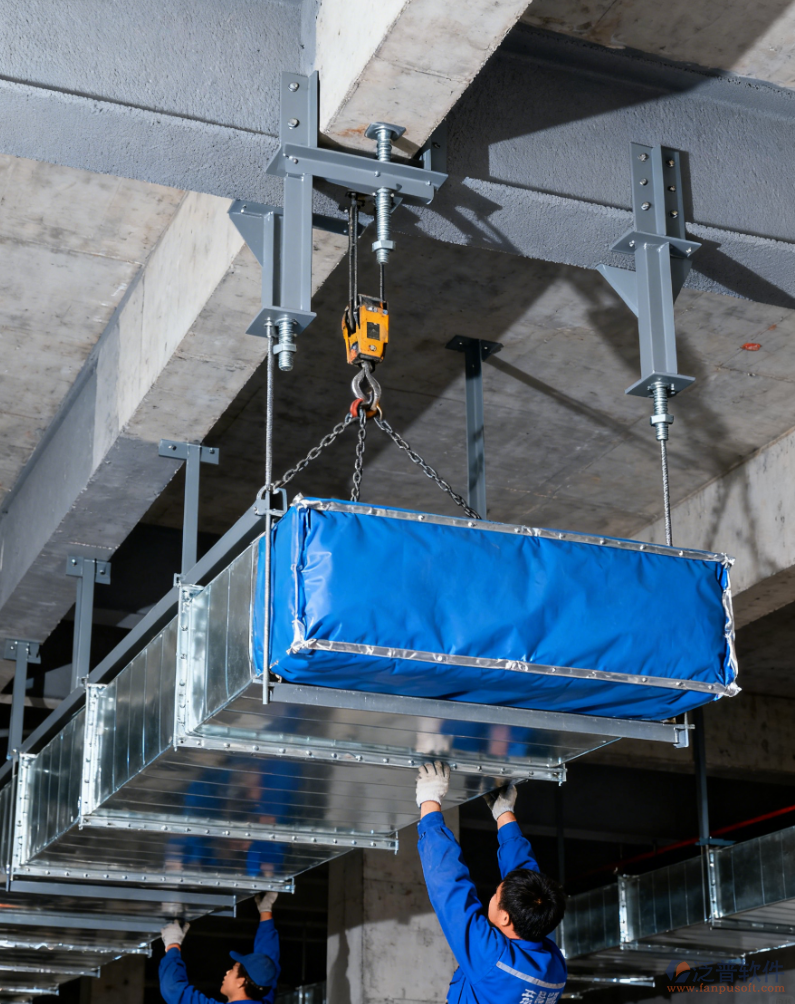 2.2.1風(fēng)管吊裝前,其單節(jié)之間的組對工作尤為重要。組對前應(yīng)先確定風(fēng)管的組對場地,一般選在風(fēng)管安裝位置的正下方,以避免組對好的風(fēng)管來回搬運所產(chǎn)生的變形,組對現(xiàn)場必須打掃干凈。將制作合格的單節(jié)風(fēng)管運至現(xiàn)場,按編號順序進行組對,聯(lián)接時送風(fēng)管所采用的法蘭密封墊選用3~5mm閉口密封海綿橡膠片。